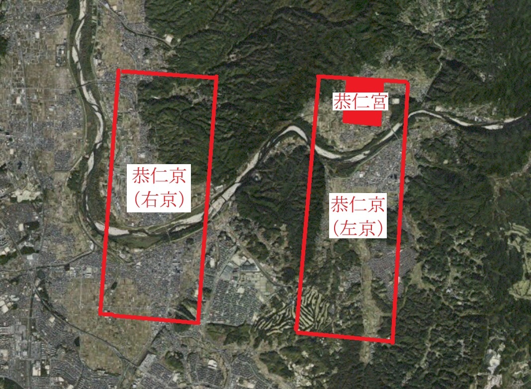 なお、天平13年(741年)9月には左京(宮が存在する地域)と右京(鹿背山で隔てられていた地域・川湊があった場所を含む)が定められ、同年11月に大養徳恭仁大宮(やまとのくにのおおみや)という正式名称が決定されています。