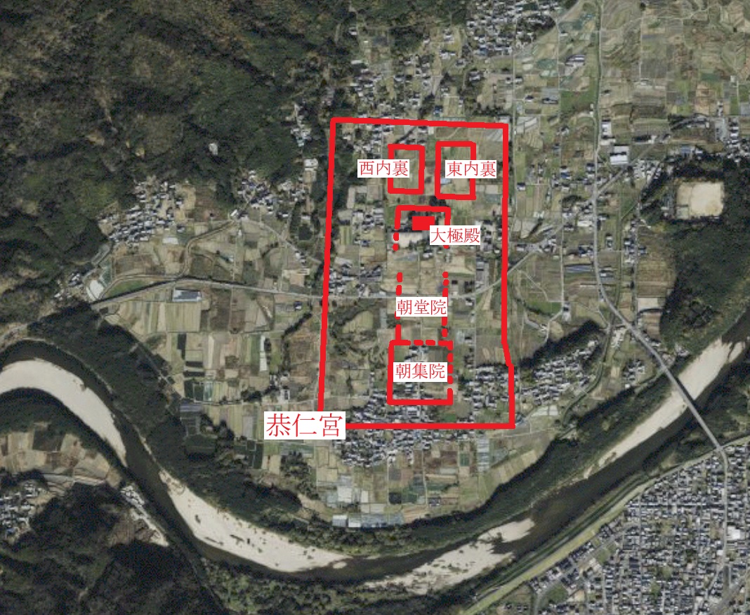 そこで、その後、元々同地にあった木津川を利用した湊(泉津)を利用し、大量の木材を運び込むことで恭仁宮の造営工事が急ピッチで進められます。なお、急ピッチで工事が進められたためか、他の都とは異なり、恭仁宮の配置は整然と並んでおらず微妙にその位置がズレているのが気になるところです。