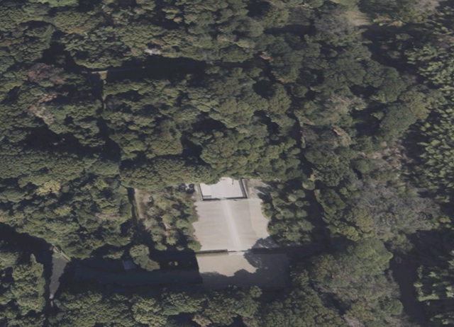 周囲が深い木々で覆われているところ、立ち入りが許されていないため内部の正確な構造は不明ですが、航空写真によると周囲に空堀と玉垣を巡らした方形陵域の中央に円丘が配されていることが確認できます。