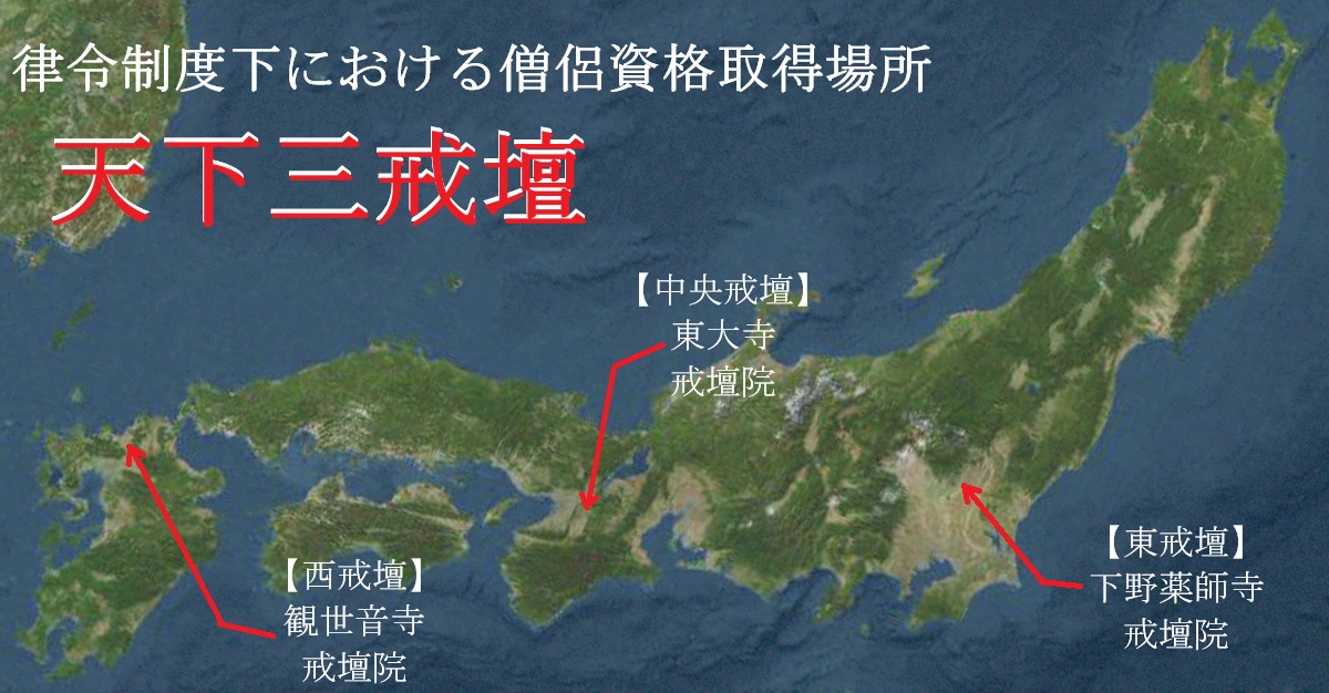 以上の結果、律令制度下では、中央は東大寺、東国は下野薬師寺、西国は観世音寺によって僧尼に対する正式な戒律教育が行われることとなり、またこれらの三戒壇に限って授戒が許されることとされました(俗世の者が僧侶になるためには、まずは得度を受けて僧侶見習い=沙弥となり、その後に授戒を受けて正式な僧侶=沙門となるという手順が必要となりました。)。