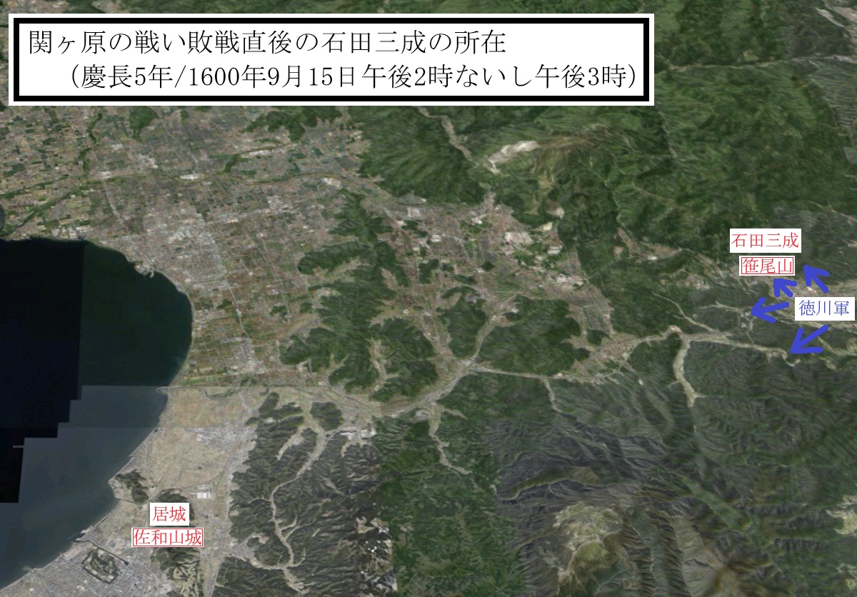 関ヶ原の戦いの際に笹尾山(現在の岐阜県関ケ原町)に本陣を置いていた石田三成は、慶長5年(1600年)9月15日午後2時または3時頃、同地で自軍の総崩れを目にします。