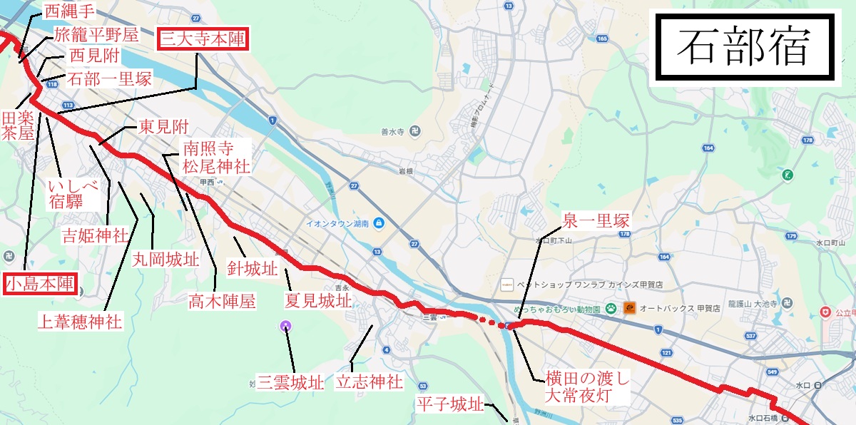 51. 石部宿(近江国甲賀郡・現在の滋賀県湖南市)3里12丁=約13.7km・32宿