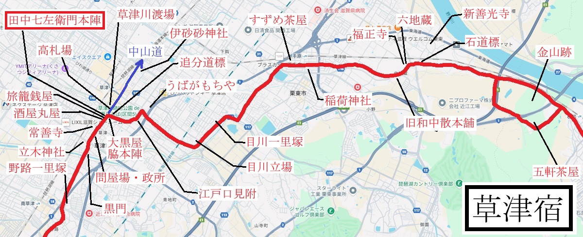 草津宿(くさつしゅく)は、古くから伊勢参宮の際の京と伊勢の中継地点として発展した宿場町であり、中山道と合流する(分岐する)草津追分があります。