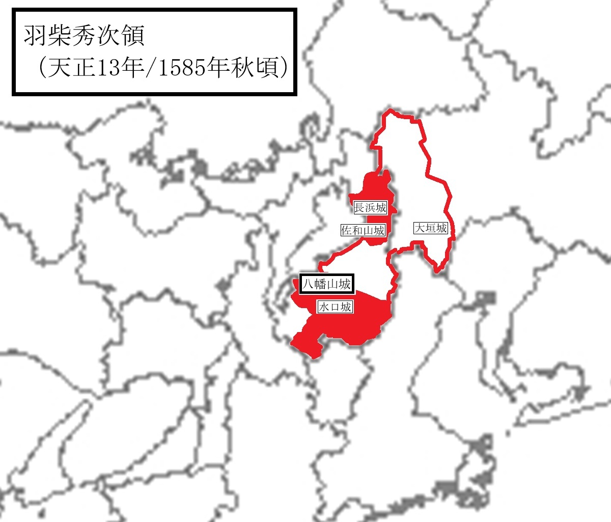 さらに、天正13年(1585年)閏8月、甥である羽柴秀次に対し、本人領として近江国蒲生・甲賀・野洲・坂田・浅井の5郡20万石が与えられ、安土城を廃して、蒲生郡八幡山(現在の滋賀県近江八幡市)に八幡山城が築かれました。