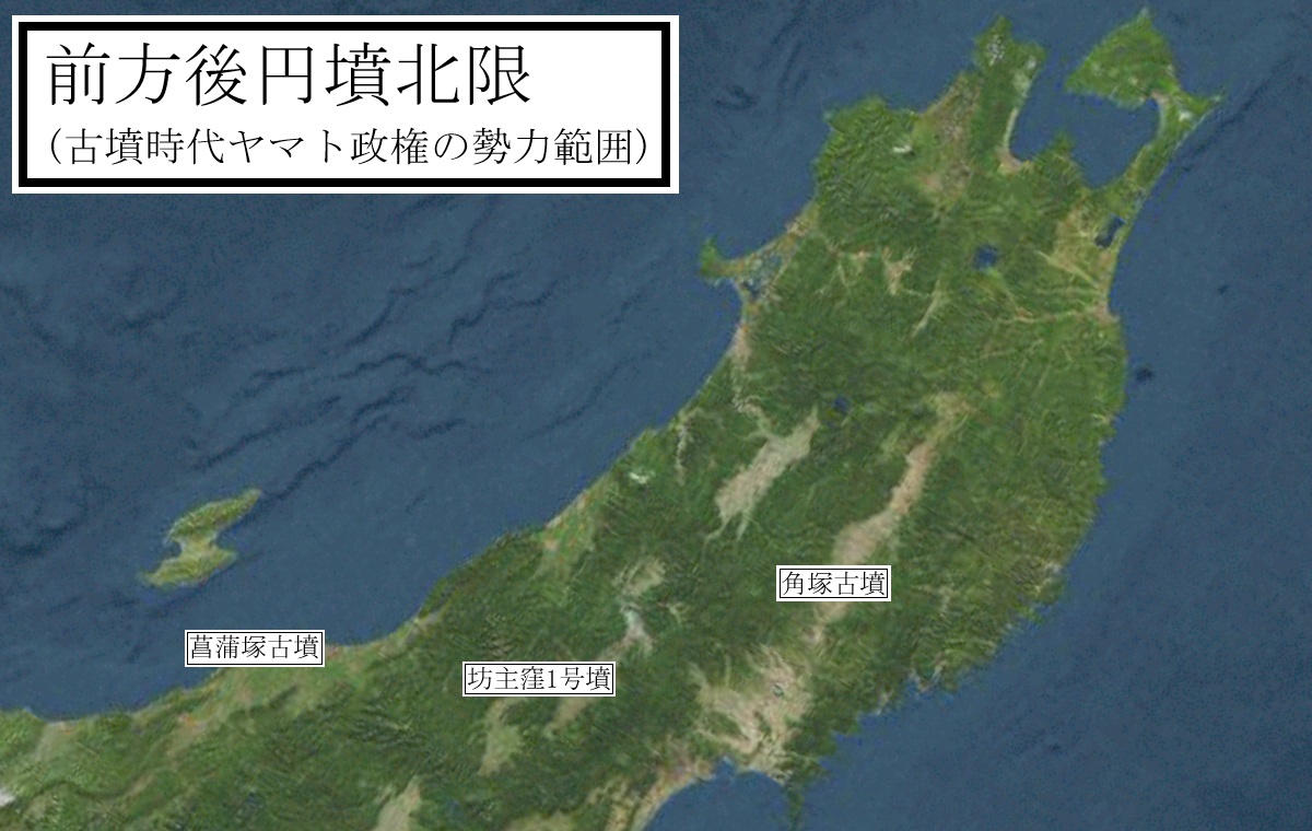 なお、古代ヤマト政権の勢力範囲であったことを示す前方後円墳の北限が太平洋側北限が角塚古墳(岩手県奥州市胆沢南都田)、日本海側内陸部北限が坊主窪1号墳(山形県東村山郡山辺町大字大寺)、日本海側沿岸部北限が菖蒲塚古墳(新潟県新潟市西蒲区竹野町)であることから、考古学的見地からもこの頃のヤマト政権の勢力範囲が概ね推定できます。