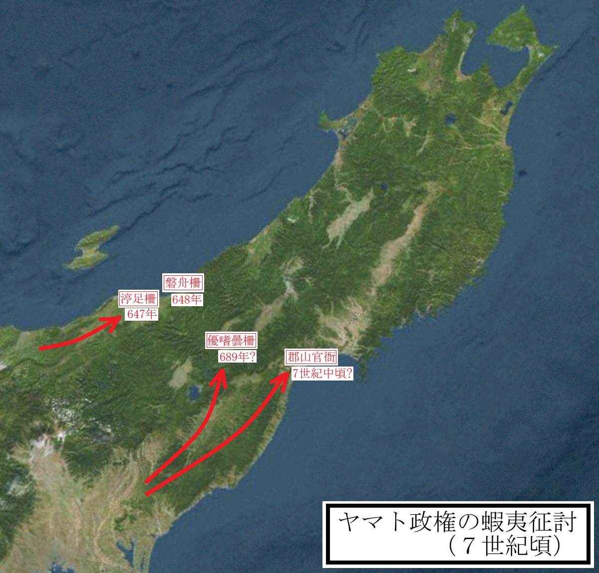 そこで、ヤマト政権は、当時未開の地であった東北に目を向け、越後平野北半と仙台平野からの北上を目指し、大化3年(647年)に越国渟足柵(現在の新潟市)を、大化4年(648年)には磐舟柵(現在の新潟県村上市)を設置するなど相次いで城柵官衙を設置し、その周辺に大量の移民を送り込むこと繰り返し、ヤマト政権の勢力範囲を拡大させていきました(日本書紀)。
