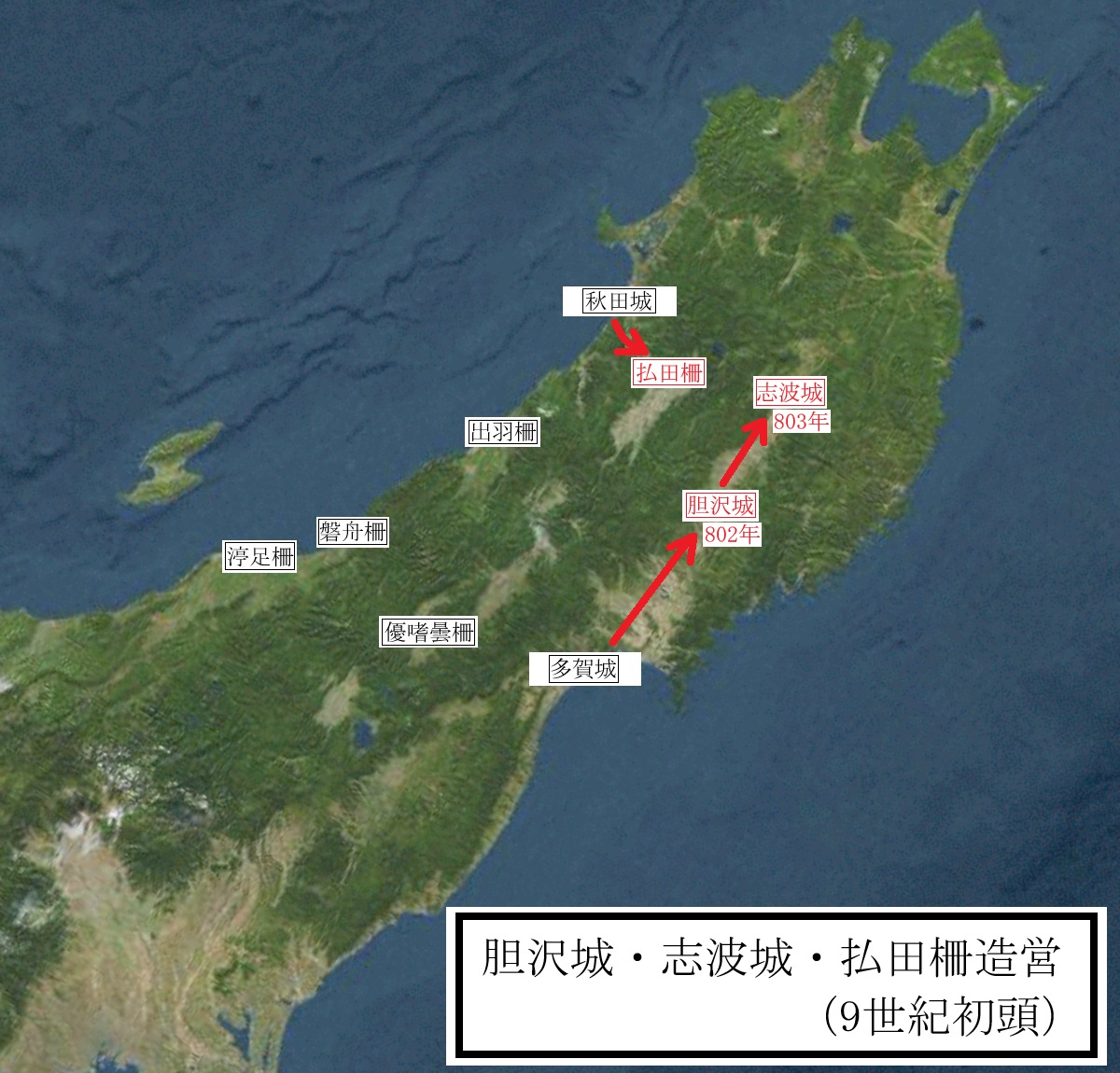 なお、陸奥国の最前線拠点であった志波城は、水害のため、弘仁2年(811年)3月頃に約10km南方の徳丹城に移転しています(類聚三代格)。